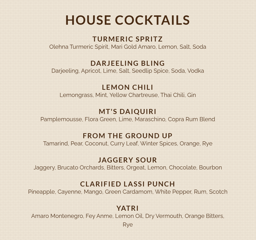 Copra is a hotspot Indian restaurant in San Francisco, highlighting the delightful cuisine of Kerala, the southern most region of India. For this menu, we worked closely with Chef Sri to utilize ingredients from his home state and pay homage to the diversity of flavors he grew up with.